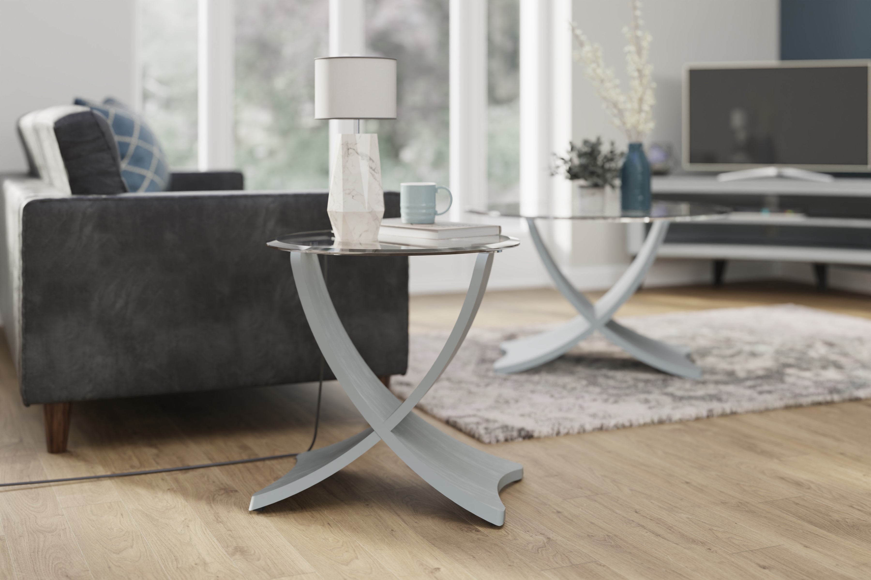 The JF308 Siena Coffee Table is both stylish and sophisticated making it the ideal addition to any home. The clear toughened glass top has a bevelled edge and sits neatly on the sweeping grey veneered legs. The contrast between the contemporary clear glass, stylish grey legs and modern chrome discs makes for a truly amazing finish. This product is ideally purchased with the matching JF309 Siena Lamp Table.